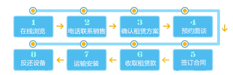 1.在線瀏覽您中意的機型。 2.直接電話聯系我公司銷售經理進行咨詢。 3.我公司銷售經理會盡快聯系您確認租賃需求,包括(但不限于)身份信息,租賃時間,租賃地址,工程項目內容等信息,并迅速給您推薦合適的產品。 4.我公司銷售代表將跟您預約時間,洽談租賃事宜。 5.洽談成功后,簽訂租賃合同。 6.合同簽訂之后,根據合同要求,收取租賃款項。 7.根據客戶要求,運輸安裝設備。